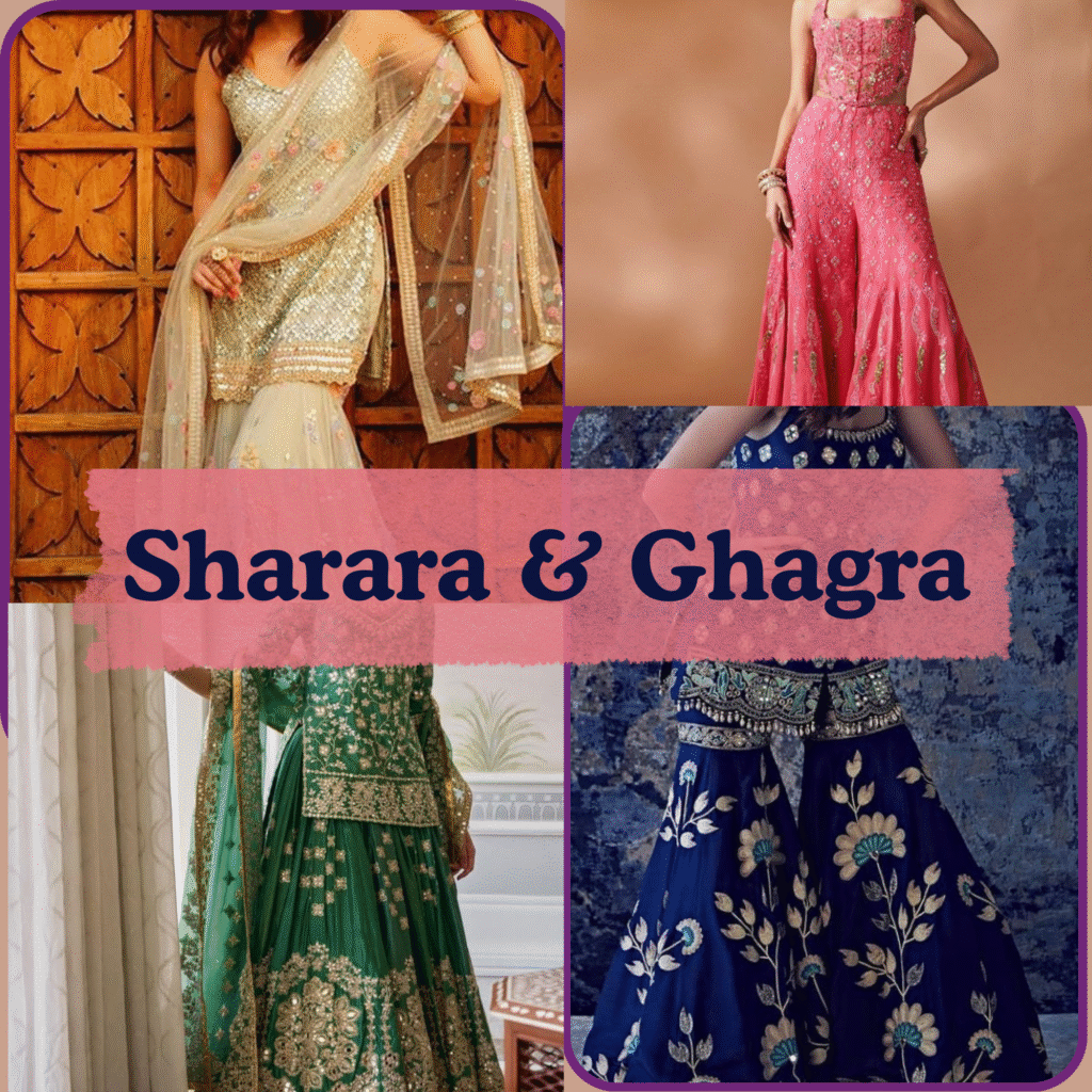 Shararas and ghaghras have made a strong comeback in festive fashion, blending traditional charm with modern cuts. A vibrant sharara set works beautifully for mehendi ceremonies or Navratri nights, while a ghagra with intricate embroidery can make you stand out at weddings and festive parties. These outfits are playful, comfortable, and add a unique rhythm to every celebration, making them a must-have addition to your wardrobe.